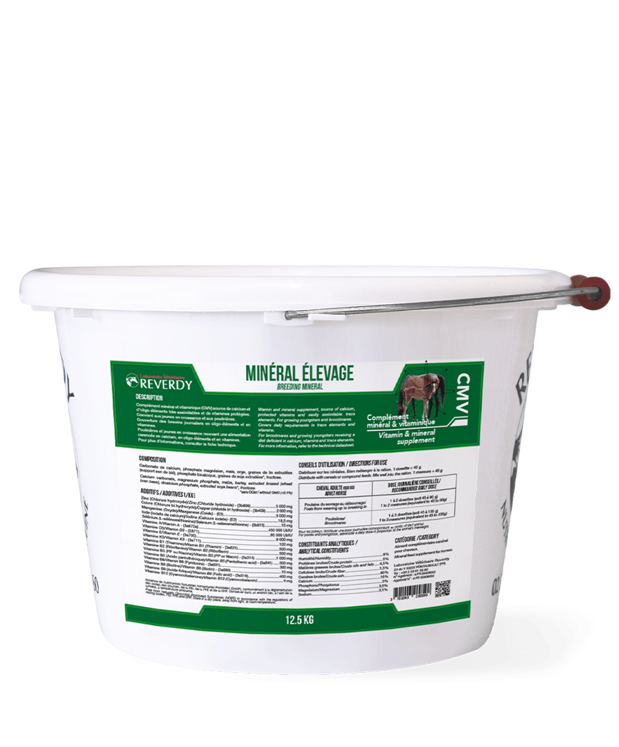 | Ingrediënten/kg | SAMENSTELLING: calciumcarbonaat, magnesiumfosfaat, maïs, gerst, geëxtrudeerd lijnzaad (tarwezemelenbasis), dicalciumfosfaat, geëxtrudeerde sojabonen, fructose. TOEVOEGINGSMIDDELEN: zink (chloorhydroxide) 5.000 mg, koper (chloortrihydroxide) 2.000 mg, mangaan (oxide) 3.000 mg, jodium (calciumjodaat) 18,5 mg, selenium (l-selenomethionine) 15 mg, vit. A 450.000 IE, vit. D3 65.000 IE, vit. E 9.000 mg, vit. K3 120 mg, vit. B1 (Thiamine) 500 mg, vit. B2 (Riboflavine) 500 mg, vit. B3 (PP ou Niacine) 1.000 mg, vit. B5 (Pantotheenzuur) 500 mg, vit. B6 (Pyridoxine) 300 mg, vit. B8 (Biotine) 15 mg, vit. B9 (Foliumzuur) 400 mg, vit. B12 (Cyanocobalamine) 4 mg. |